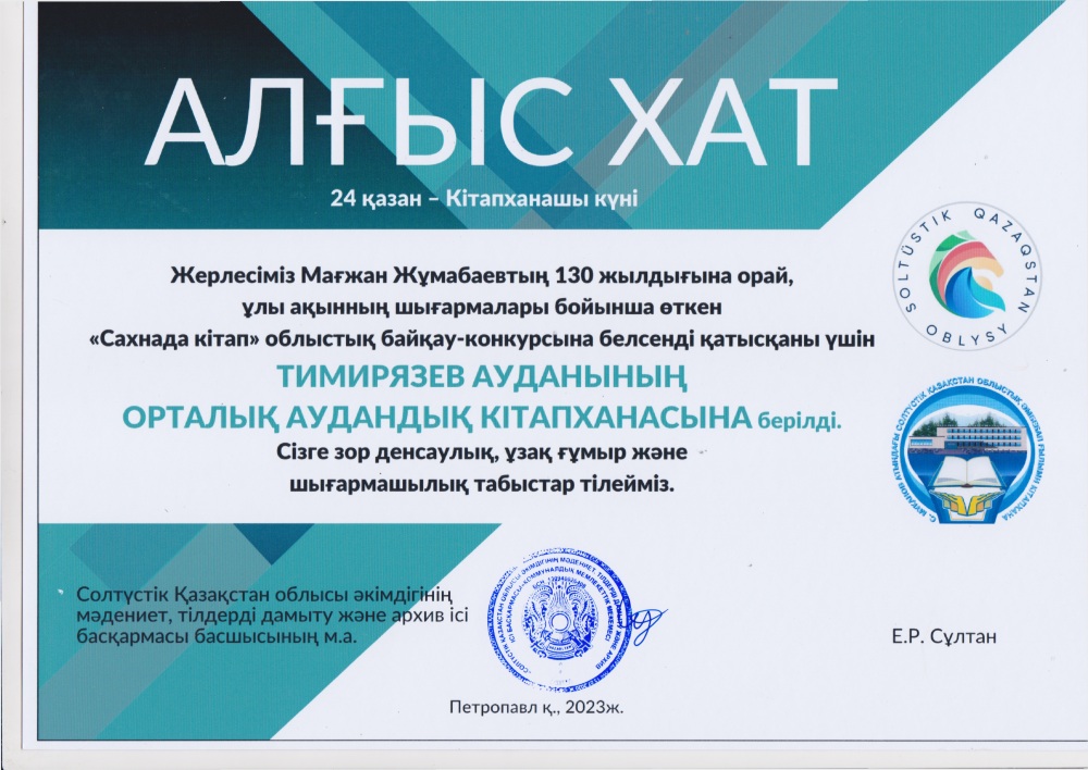 20 октября в рамках празднования Дня библиотекаря — 2023, за участие в областном смотре — конкурсе среди библиотек «Книга на сцене», посвященном 130–летию Магжана Жумабаева, великому поэту – земляку, проводимый ОУНБ им. Сабита Муканова совместно с КГУ «Управление культуры, развития языков и архивного дела акимата СКО», Центральная районная библиотека была награждена благодарственным письмом.