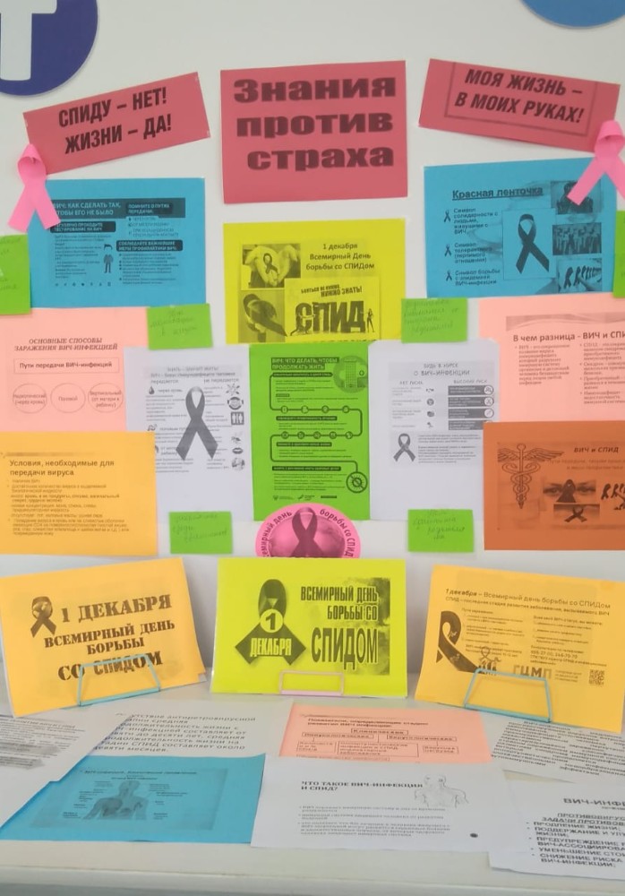 1 декабря - Всемирный день борьбы со СПИДом. В этот день в Степной сельской библиотеке прошла квилт - акция "Знания против страха". Читателям представлен информационный стенд, который содержит информацию о том, что такое ВИЧ /СПИД, о передаче ВИЧ - инфекции и профилактике этого заболевания. На стикерах любой желающий мог написать свои мысли по теме мероприятия, а также аргументы в пользу здорового образа жизни. Таким образом на информационном стенде сложился цветной квилт "лоскутное полотно" с информацией о ВИЧ/ СПИД и его профилактике. Мероприятие направлено на повышение осведомленности об этом заболевании, а также, привлечение внимания общественности к проблеме СПИДа.