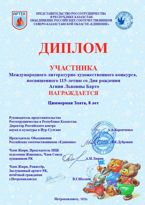 Участники Международного литературно-художественного конкурса, посвящённого 115-летию со Дня рождения Агнии Львовны Барто, Найда Саша (Тимирязевский с/о) и Циммерман Злата (Комсомольский с/о) приглашены по бесплатной путевке в Международный детский центр «Артек». Поздравляем!!!!!