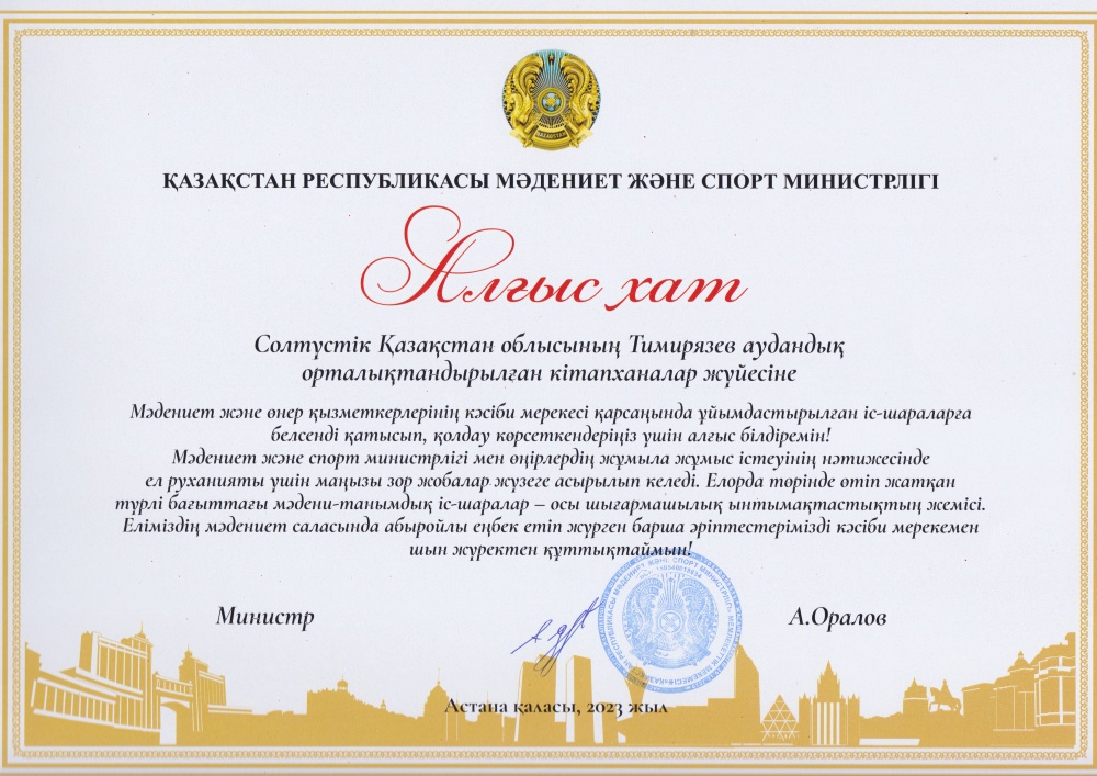 Благодарственным письмом Министра культуры и спорта Асхата Оралова награждена "Централизованная библиотечная система" Тимирязевского района Северо-Казахстанской области за активное участие и поддержку в мероприятиях, организованных в преддверии профессионального праздника работников культуры и искусства и за почетный труд в области культуры нашей страны! Благодарим за высокую оценку работы библиотек! Поздравляем с почетной наградой всех сотрудников библиотечной сети Тимирязевского района!